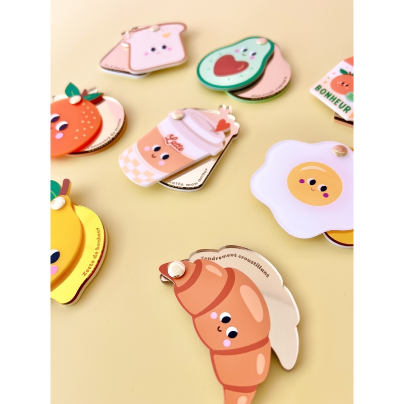 Le miroir de poche croissant fait partie de notre collection Club P'tit déj, une série de créations inspirées des plaisirs du matin : café, croissants, agrumes et gourmandises. Une collection colorée et joyeuse qui célèbre les petits bonheurs du quotidien.