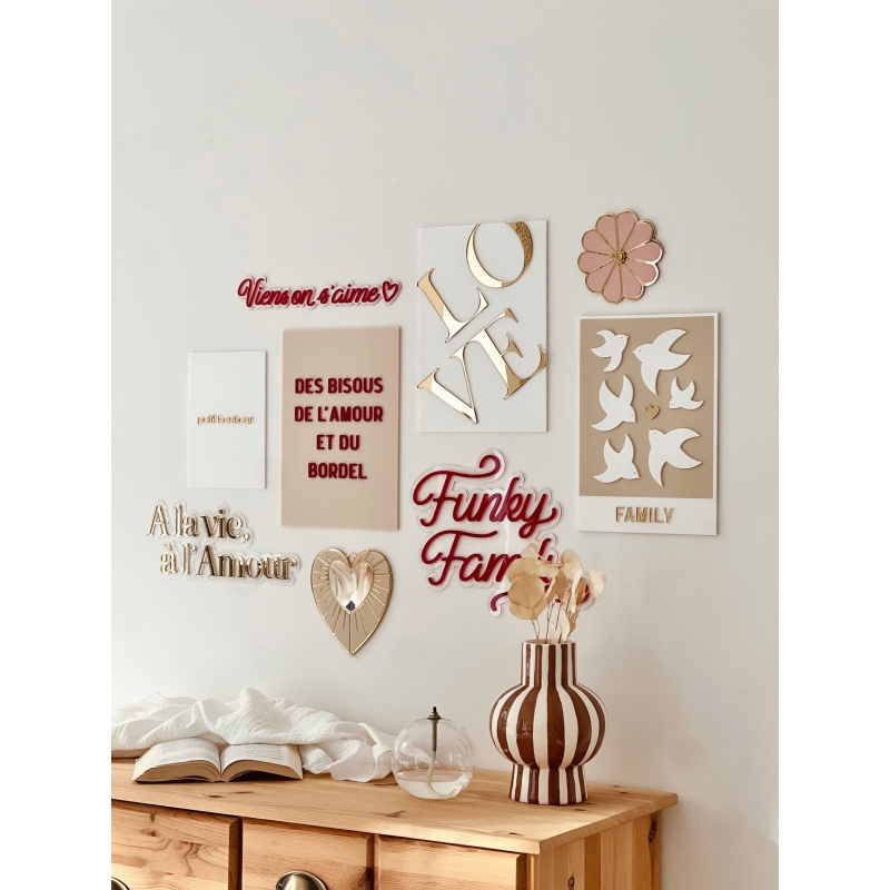 Donnez du cachet à votre décoration murale grâce à cette affiche en bois ou en plexiglas de couleur et au lettrage en relief. On adore sa phrase douce et intemporelle "La vie est belle en famille".