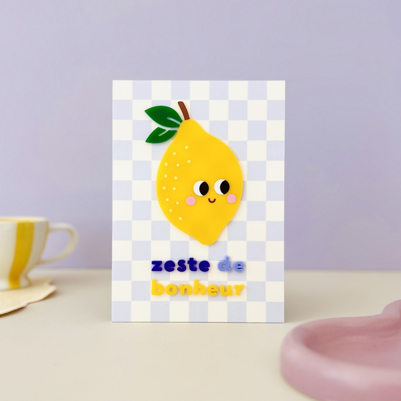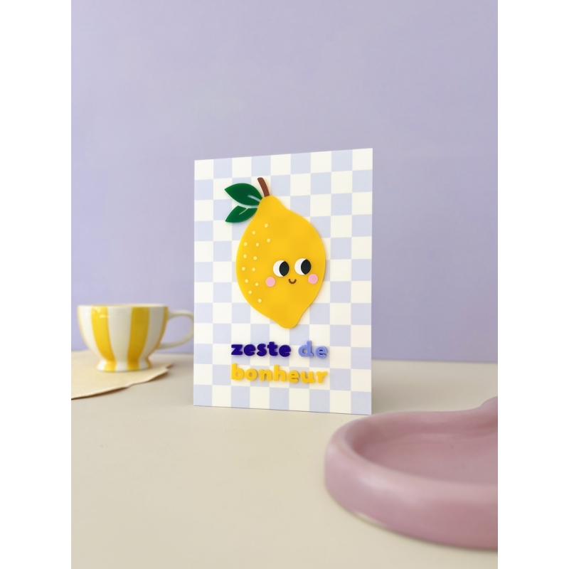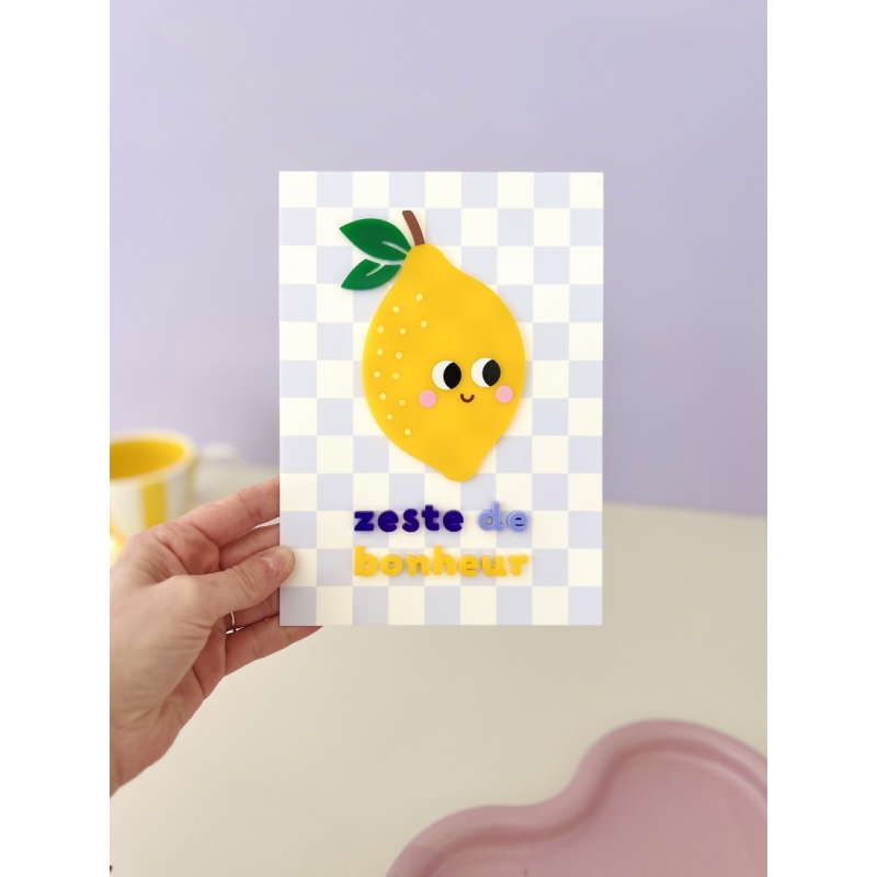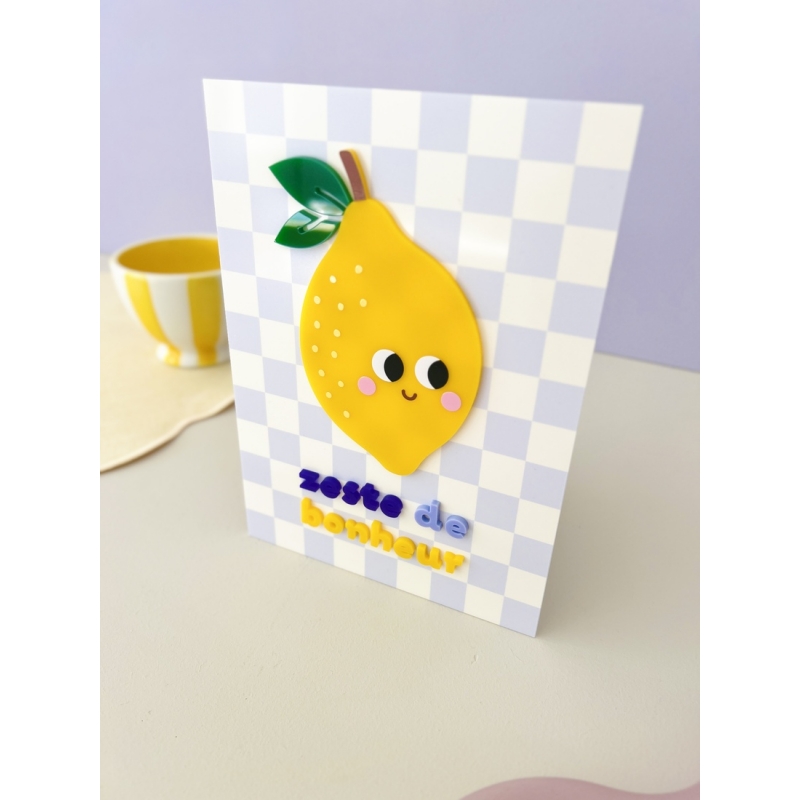 Avec son citron jaune éclatant et son message "zeste de bonheur", cette affiche en plexiglas donne immédiatement le ton. Inspirée de l’univers du petit déjeuner, elle insuffle énergie et bonne humeur dès le matin. Son fond à carreaux doux rappelle les nappes de cuisine, tandis que le citron graphique, aux formes rondes et joyeuses, évoque la fraîcheur des agrumes pressés et les matins lumineux d’été.