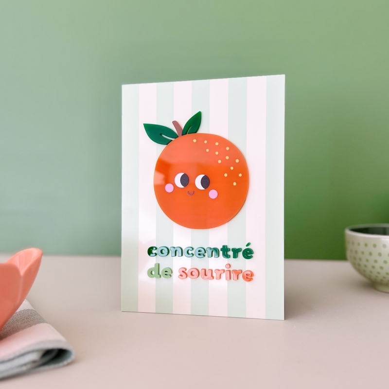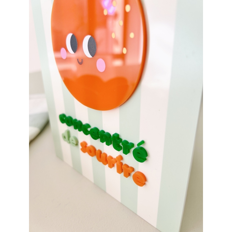 Avec son illustration d’orange souriante et son message "Concentré de sourire", cette affiche en plexiglas apporte instantanément une dose de bonne humeur à votre intérieur. Son design coloré et lumineux évoque les petits plaisirs du matin et les jus d’agrumes fraîchement pressés. Parfaite dans une cuisine ou un coin petit déjeuner, cette décoration murale donne du pep’s à votre décoration. Son fond rayé et son orange en relief créent un joli jeu de volumes et de couleurs. Le plexiglas capte la lumière et fait vibrer les teintes selon l’éclairage de la pièce.
