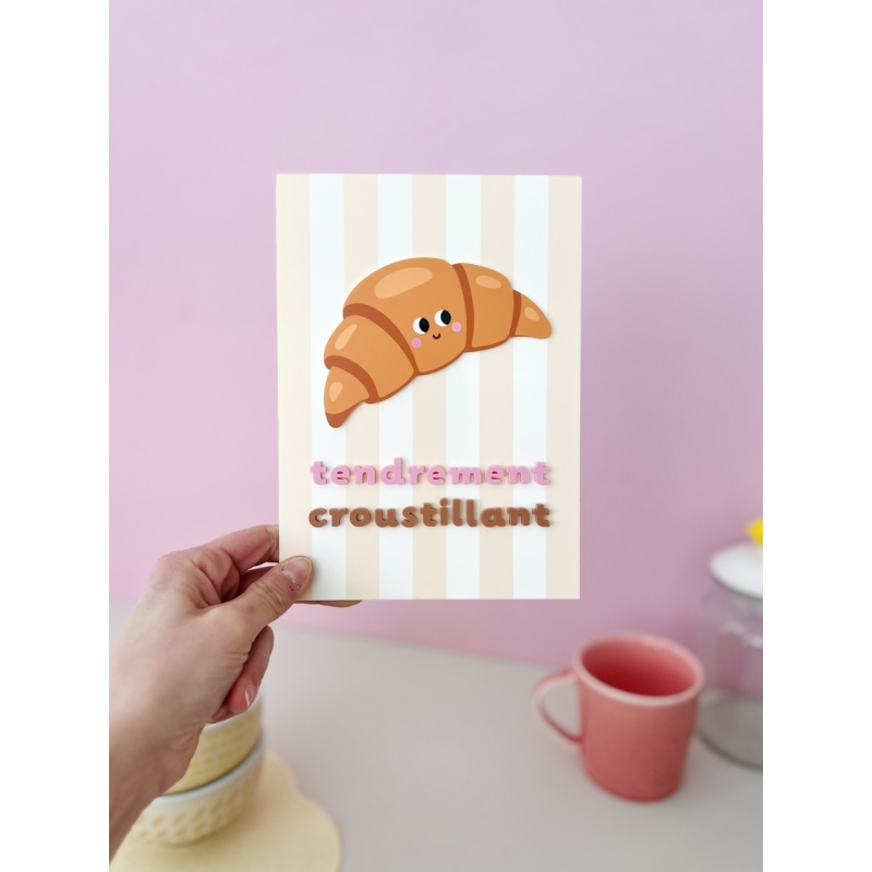 Le croissant est l’un des symboles les plus emblématiques du petit déjeuner français. Avec son design simple et expressif, cette affiche transforme cette viennoiserie iconique en un élément décoratif ludique et attachant. Le fond rayé et les éléments en relief créent un joli jeu de volumes qui attire naturellement le regard.