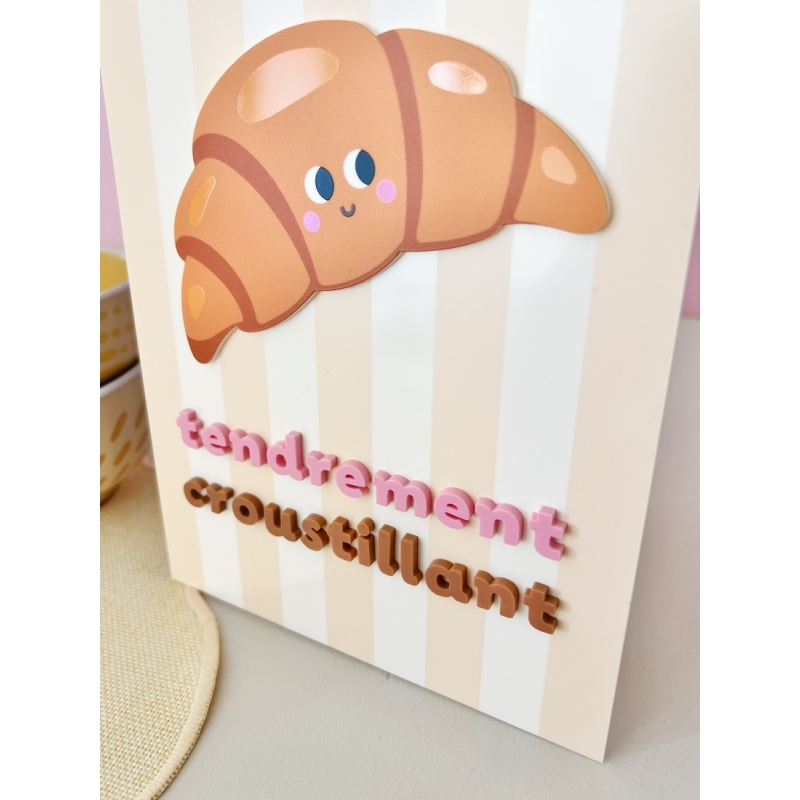 Avec son illustration de croissant souriant et son message "Tendrement croustillant", cette affiche en plexiglas apporte une touche chaleureuse et gourmande à votre décoration. Inspirée de l’univers du petit déjeuner, elle évoque immédiatement les odeurs de viennoiseries et les matins qui commencent doucement. Placée dans une cuisine, un coin café ou un espace brunch, elle apporte instantanément une note joyeuse au mur.