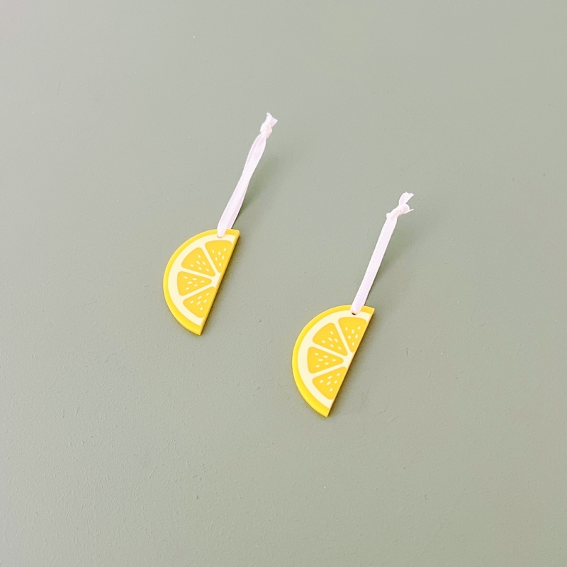 Lot de 2 suspensions quartier de citron en plexiglas jaune imprimé avec ruban champagne, à suspendre pour décorer votre arbre à décorer au fil des saisons.