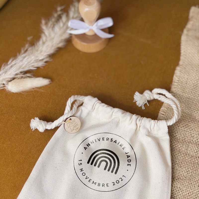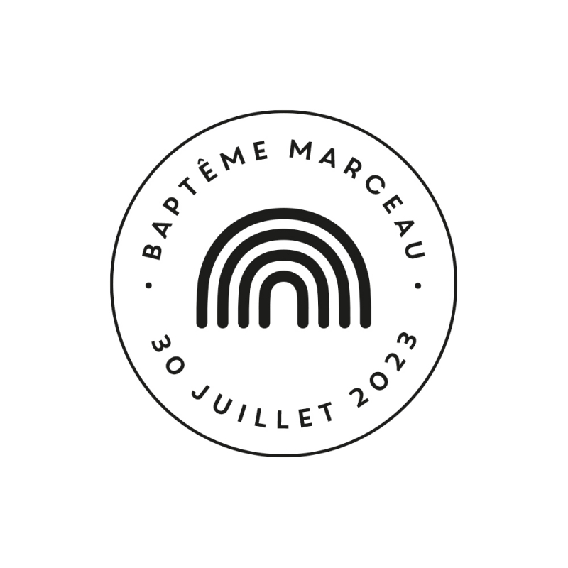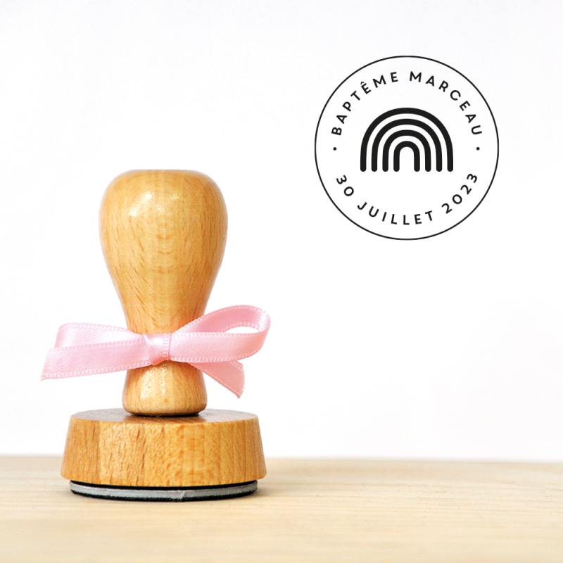 Personnalisez un joli tampon encreur sur le thème des arc-en-ciel avec le prénom de votre enfant et une date. Que ce soit pour une naissance, un baptême ou un anniversaire, cet outil est multi-usages et pourra vous servir pour customiser plusieurs supports. On adore ce modèle rond avec son petit arc-en-ciel.
