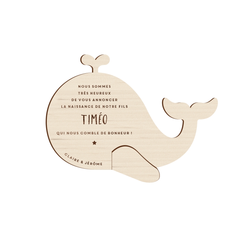 Envoyez à vos proches un faire-part original en 3D en forme de petite baleine. Entièrement découpé en bois, vos convives pourront conserver le faire-part en guise de décoration en l'honneur de l'arrivée de votre petit. La baleine est personnalisable au recto et au verso (en option) avec les informations relatives à la naissance de votre bébé.