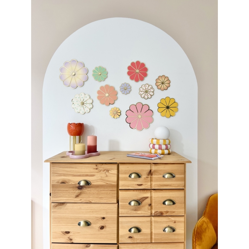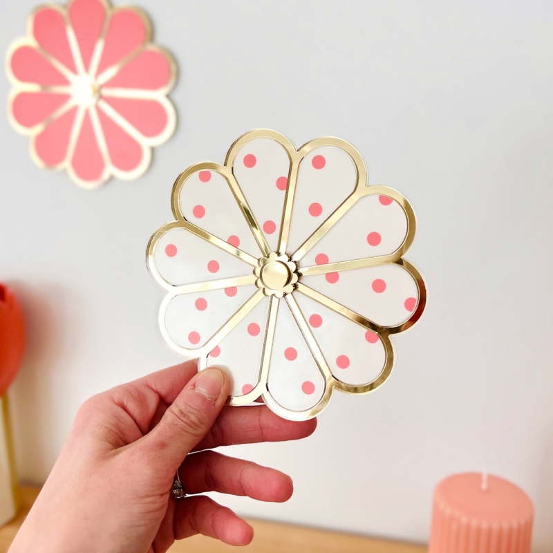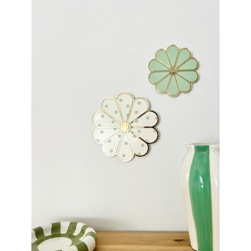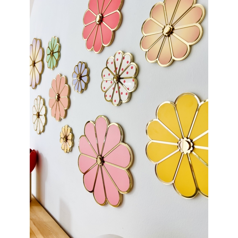 Apportez une note graphique et pétillante à votre intérieur avec notre fleur murale en plexiglas à pois. Son motif délicat associe une base colorée à des pois contrastants, pour un rendu à la fois moderne et coloré. Les jeux de matières entre plexiglas à pois et miroir champagne créent de subtils reflets qui évoluent avec la lumière naturelle.