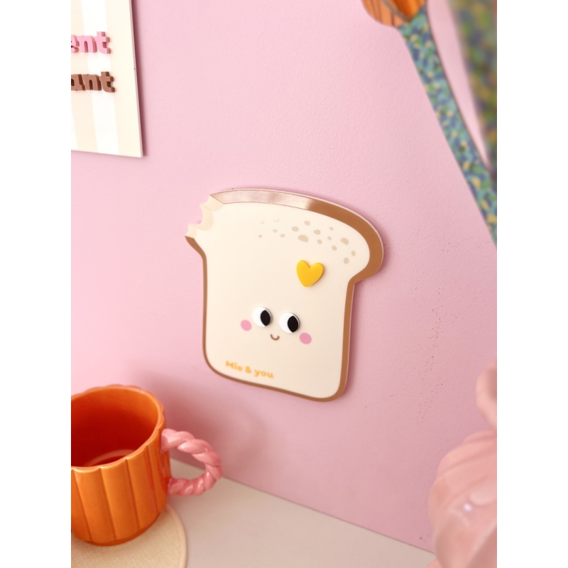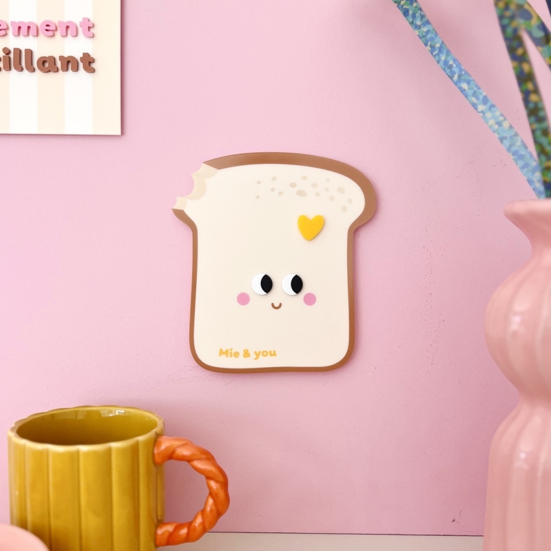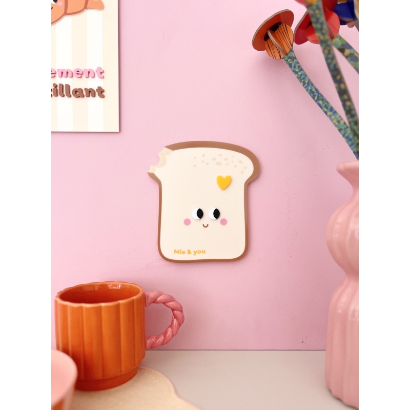 Avec sa forme de brioche moelleuse et son design graphique aux petits yeux expressifs, cette décoration murale apporte instantanément une touche chaleureuse à votre intérieur. Son message "Mie & you" joue avec les mots et évoque la complicité des petits déjeuners partagés. Une pièce décorative à la fois gourmande, moderne et pleine de personnalité.