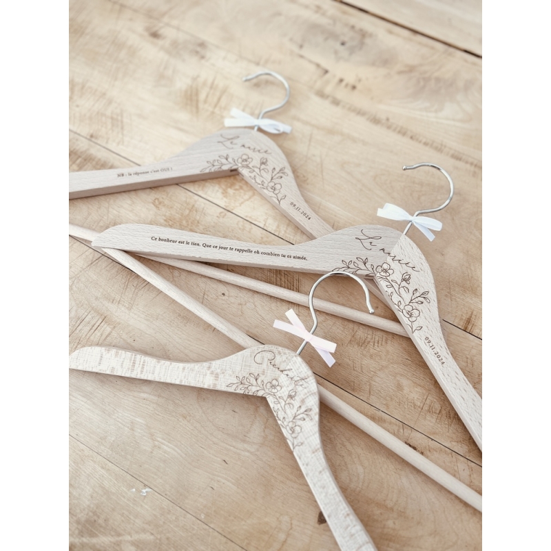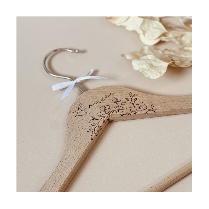 Futurs marié(e)s, vous allez adorer personnaliser ces jolis cintres en bois pour pouvoir suspendre dessus vos tenues pour le jour J. Le vrai plus du modèle Blossom : ses belles fleurs finement gravées sur le bois qui mettront en valeur les mots "La mariée" ou "Le marié".