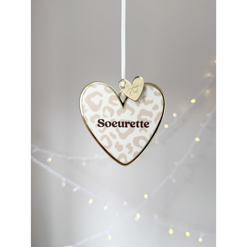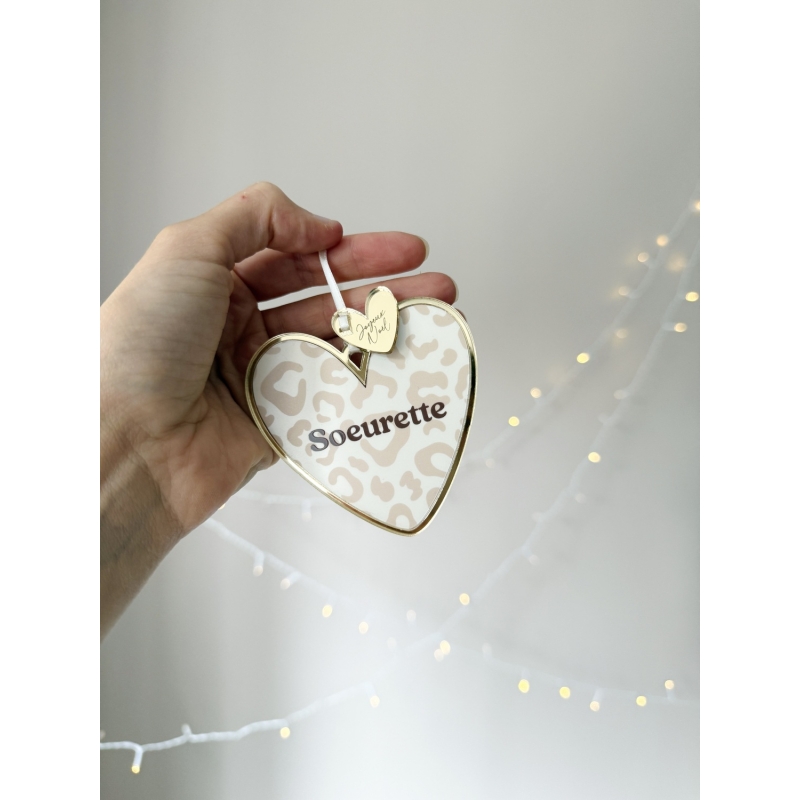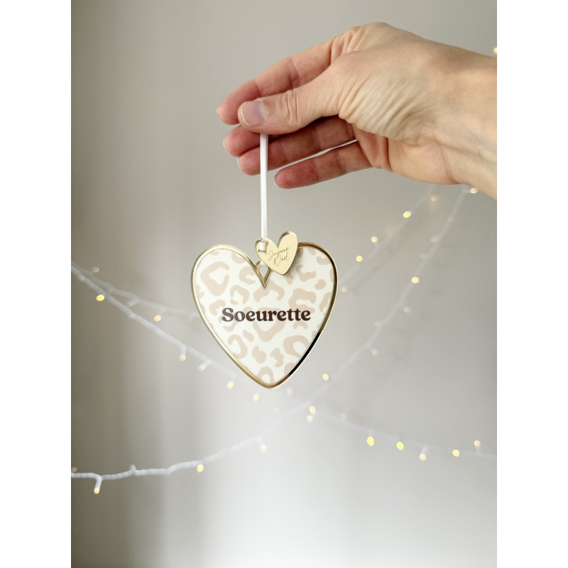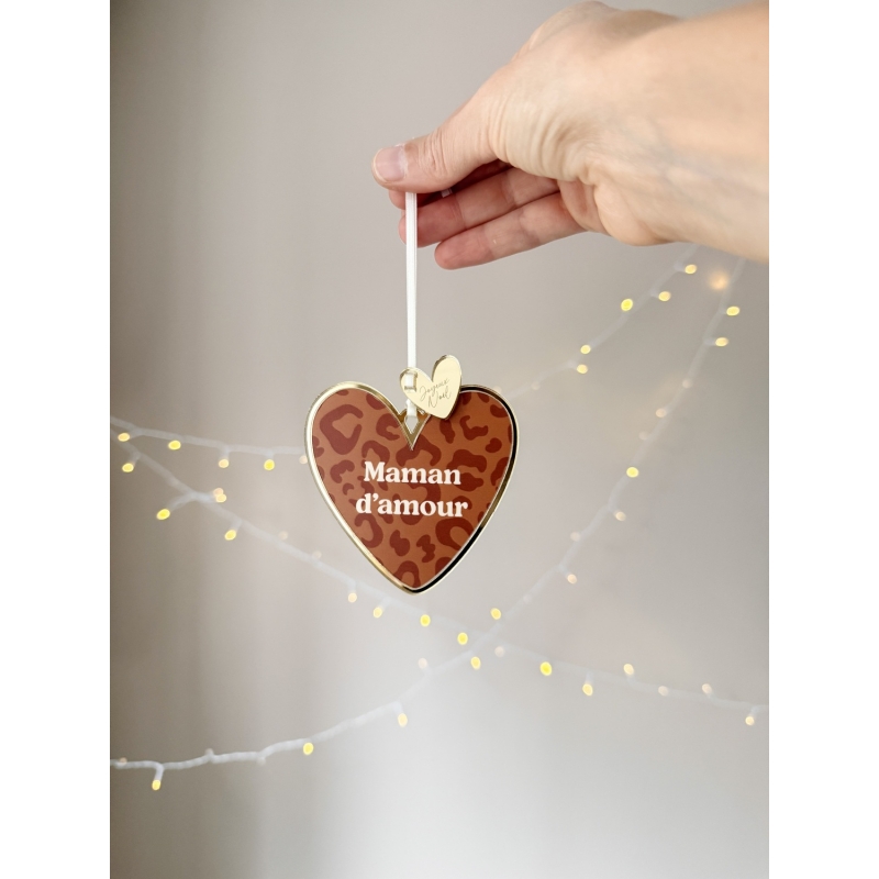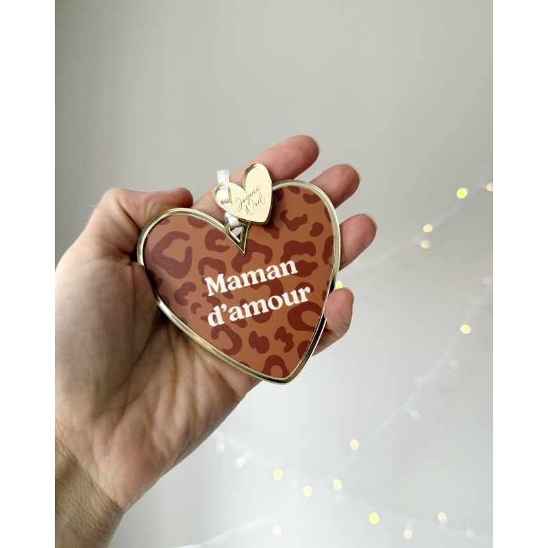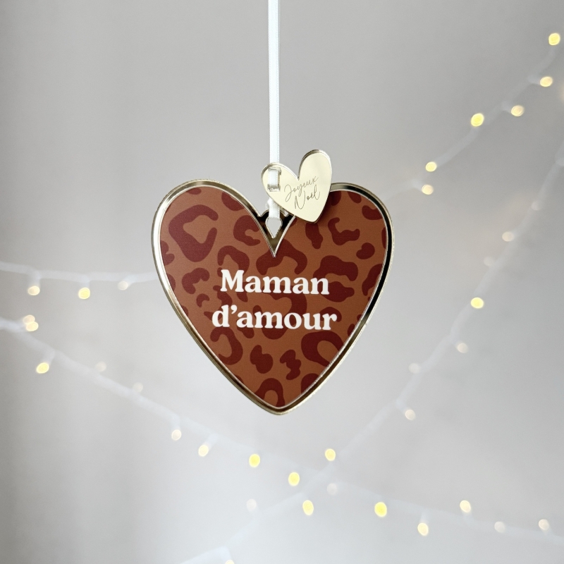 Faites briller votre sapin avec nos suspensions de Noël Coeur en plexiglas. Motif léopard (4 coloris), sublimé par un contour miroir champagne et une breloque "Joyeux Noël". Chaque coeur est disponible avec de nombreux textes affectueux (maman d’amour, tonton d’amour, frangin, petit cœur…) ou citations comme "Happy family". Une décoration chic et symbolique pour un Noël unique !