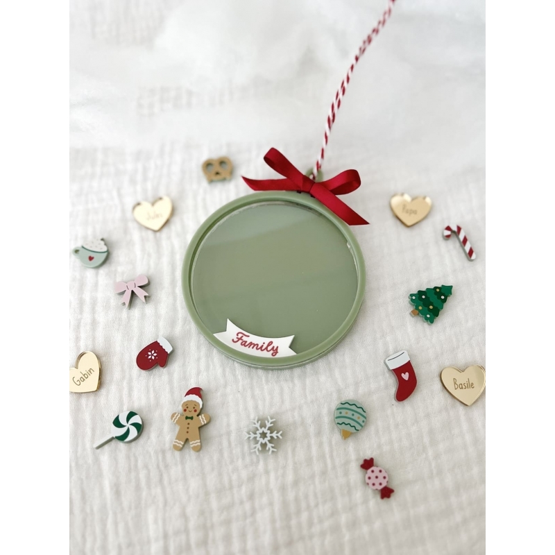 Cette boule de Noël évolutive se compose d’une sphère que vous pouvez remplir selon vos envies : à l’intérieur, des petits coeurs en miroir champagne gravés aux prénoms des membres de votre famille, le tout entouré par des confettis aux formes emblématiques de Noël (pain d’épices, bottes de Noël, gant, sapin, flocon, sucre d’orge et bien d’autres détails colorés).