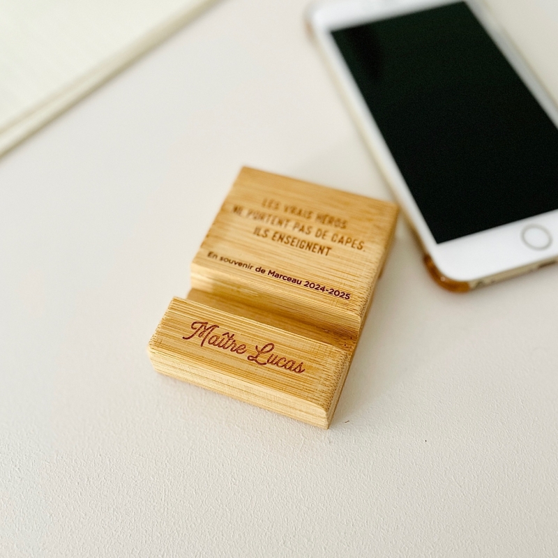Ce support de téléphone ou tablette en bois de bambou est une idée astucieuse pour remercier le maître de votre enfant à la fin de l’année scolaire. Il lui permettra de poser son téléphone sur son bureau avec élégance, tout en gardant un souvenir personnalisé de sa classe.
