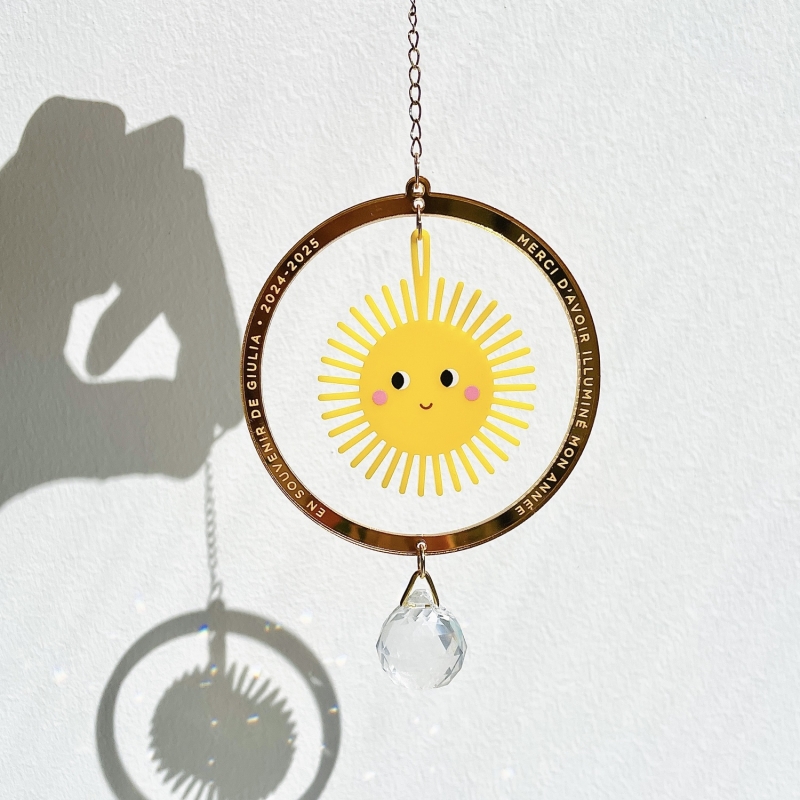 Composé d’un cercle en miroir doré et d’un prisme en verre, ce sun catcher capte la lumière et la diffuse en petits reflets colorés. Il est personnalisé avec votre texte pour en faire un objet symbolique, à la fois décoratif et porteur d’émotion. Idéal pour offrir un remerciement original et solaire en fin d’année scolaire.
