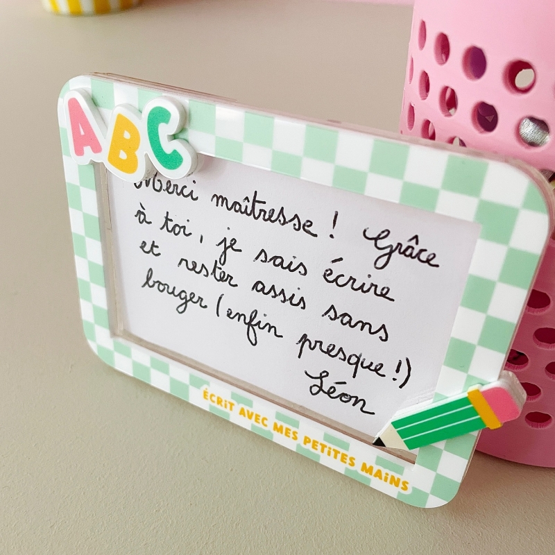 Parce qu'il est celui qui apprend à écrire… Offrez au maître ou à la maîtresse un magnet personnalisé avec un mot ou une phrase écrite par votre enfant. Une idée originale et pleine de sens pour garder un souvenir unique et touchant de cette belle année scolaire et de l'évolution de l'enfant.