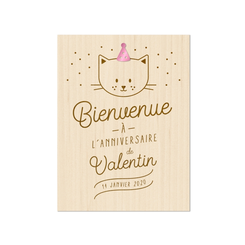 Joli panneau en bois pour décorer le lieu de réception du baptême ou de l'anniversaire de votre enfant. Illustré d'une petite tête de chat, il introduira parfaitement le thème de votre événement. Après l'événement, vous pourrez décorer la chambre de votre enfant avec le panneau en bois personnalisé.