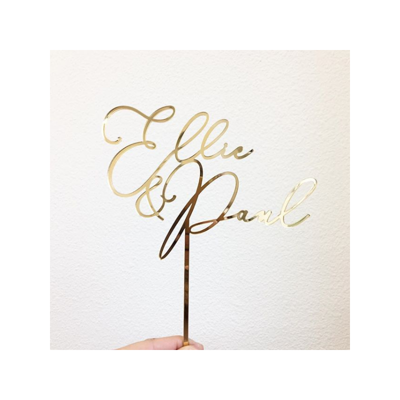 Décorez votre pièce montée ou gâteau de mariage avec un joli cake topper doré. Ce modèle est personnalisable avec vos prénoms écrits dans une écriture manuscrite. Son style élégant et raffiné donnera une touche design à votre dessert !