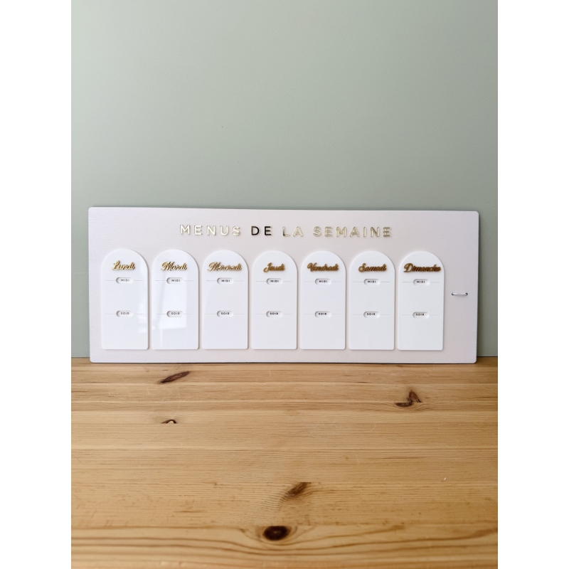 Découvrez notre planning de menus de la semaine en bois, effaçable et réutilisable à volonté. Idéal pour bien organiser vos repas hebdomadaires, il ajoute une touche élégante à votre cuisine tout en vous aidant à mieux planifier vos repas. Grâce à ses séparateurs, vous pourrez inscrire un menu le midi et le soir.