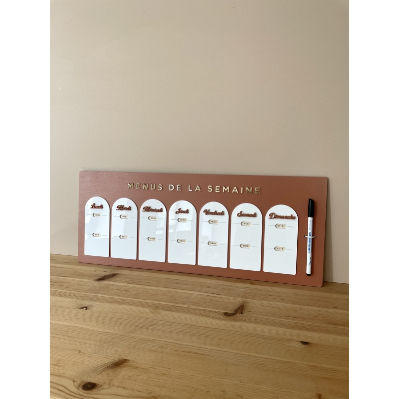 Le fond du planning est disponible en bois brut ou en bois peint de couleur (terracotta, sauge, rose poudré ou lin). Les cases et titres sont en plexiglas.