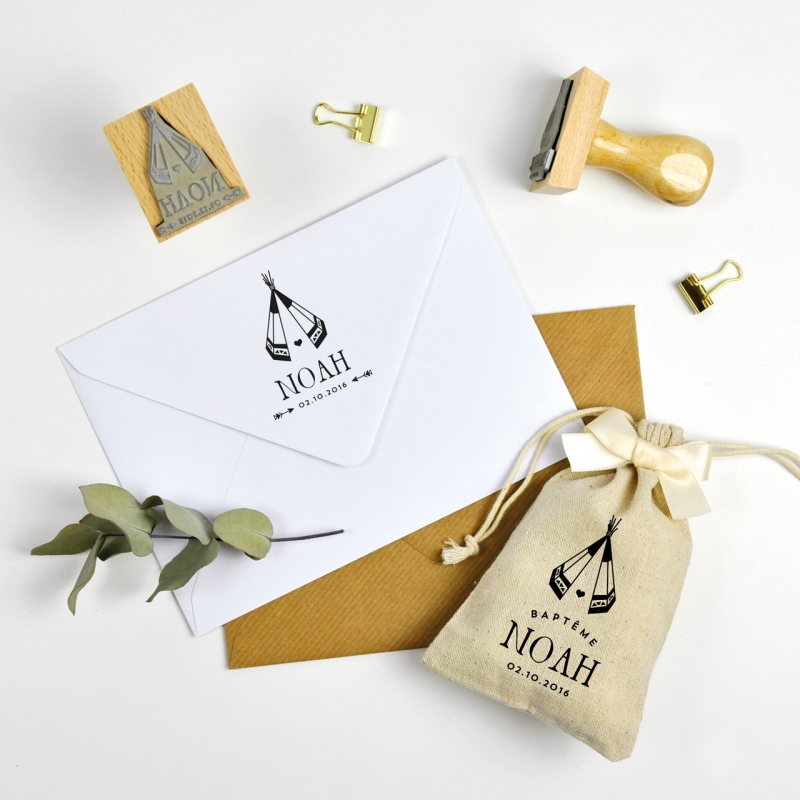 Annoncez la naissance de votre enfant avec cette mignonnerie : un tampon naissance personnalisé et illustré d’un joli tipi bohème. Idéal pour ajouter une touche graphique sur les enveloppes contenants vos faire-part, il peut également servir pour marquer les habits de bébé avec un encreur textile.