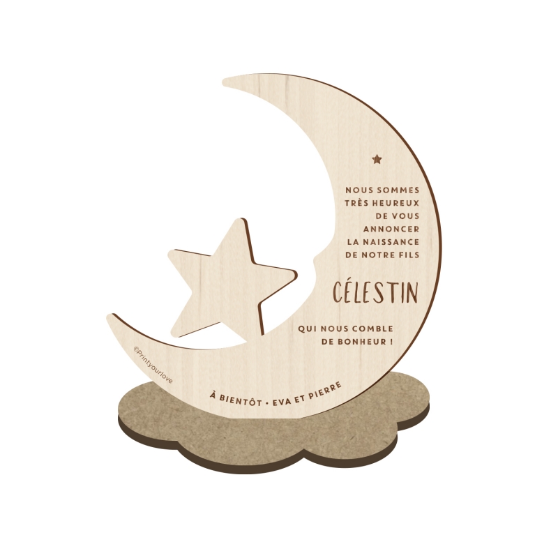 Le faire-part se présente sous forme de kit de 2 pièces (la lune en faire-part et le socle nuage).