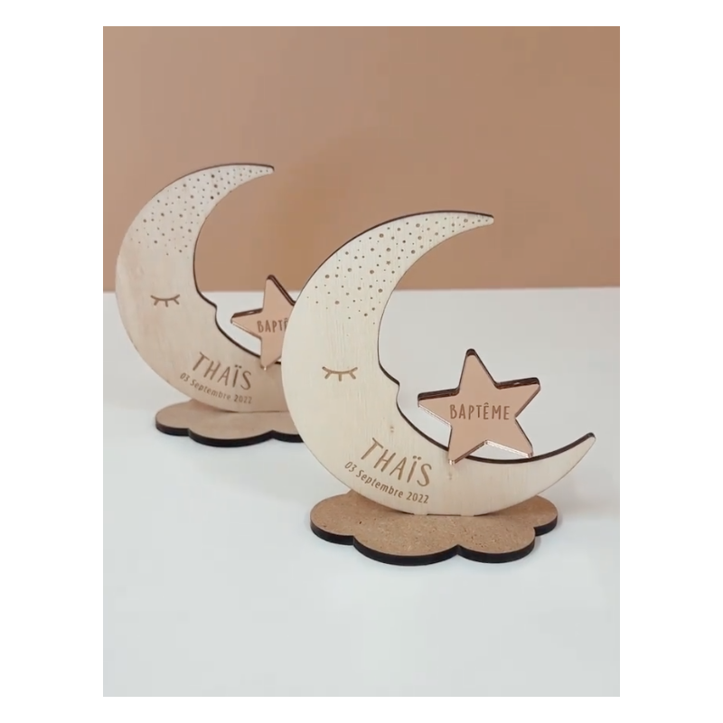 Annoncez l'arrivée de bébé avec un faire-part de naissance original et tout en douceur : le faire-part lune. Grâce à son socle en bois en forme de nuage, vos proches pourront le conserver en décoration. Au recto, le prénom et la date de naissance sont gravés sur la lune et les informations supplémentaires (poids, taille et horaire) sur une étoile en plexiglas miroir (or, argent ou rose gold).