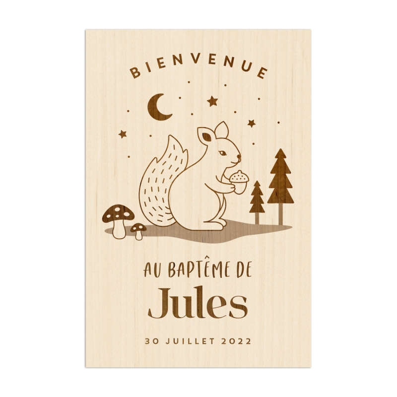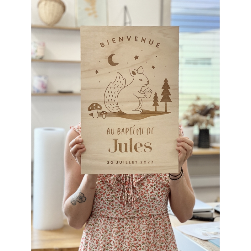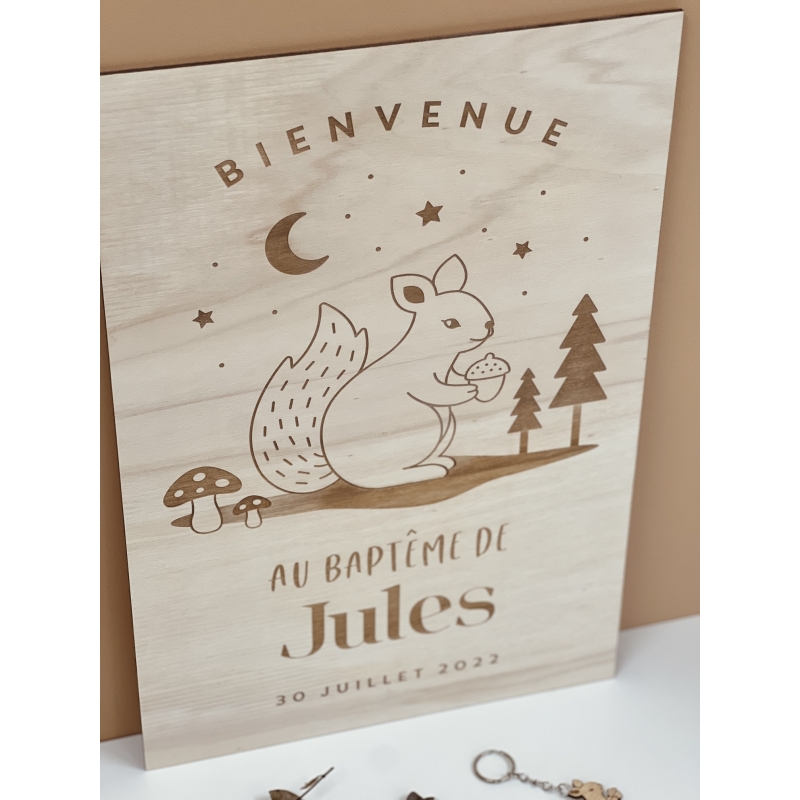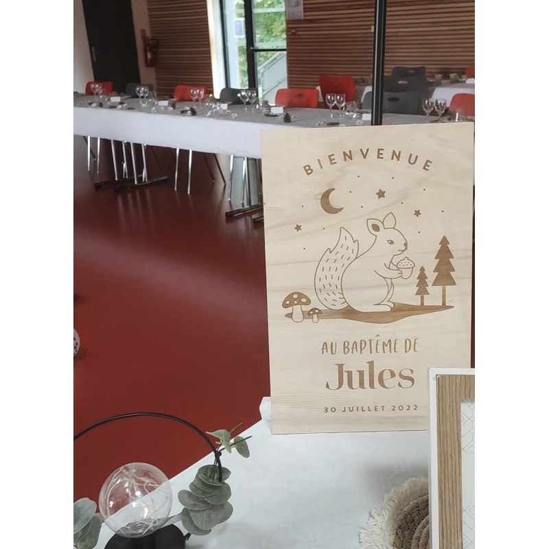 Votre événement est sur le thème de la forêt et des animaux ? Ce panneau d'accueil en bois sera parfait avec son illustration de petit écureuil. Vous pouvez le personnaliser pour un anniversaire ou un baptême avec le prénom de l'enfant et une date.