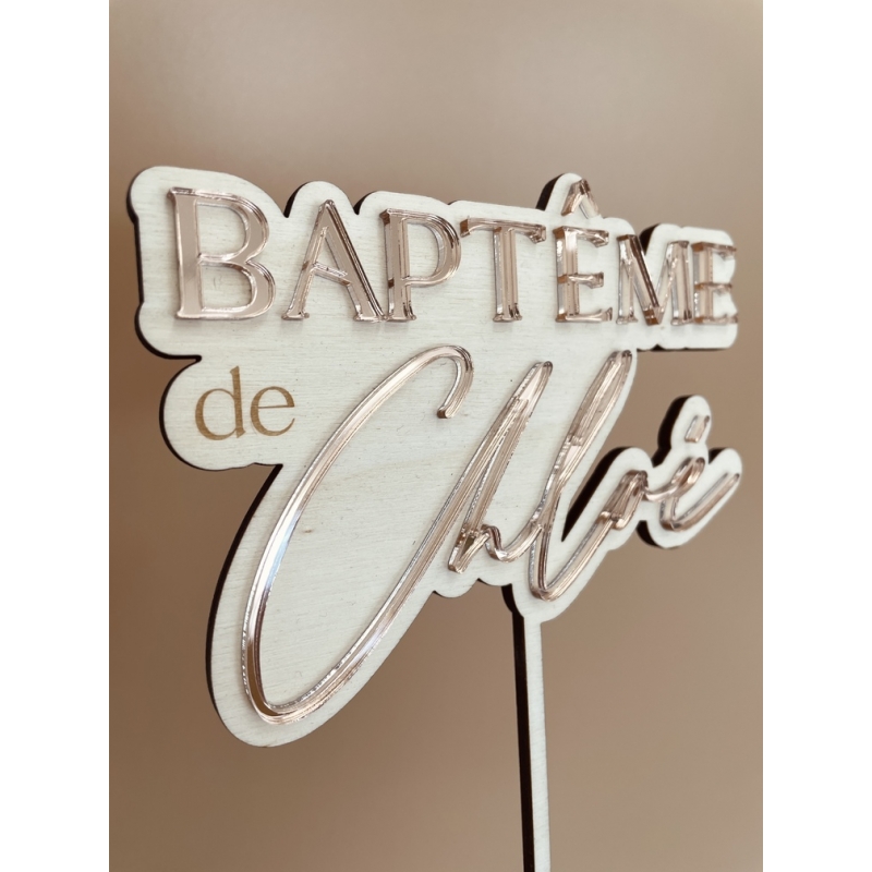 Pour le baptême de votre enfant, craquez pour ce cake topper bi-matières avec son application de plexiglas miroir sur les lettres. Un rendu élégant et chic qui sera la cerise sur votre gâteau !