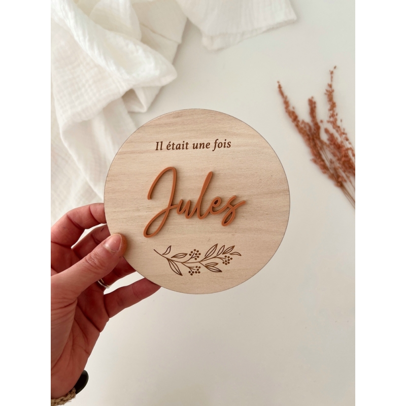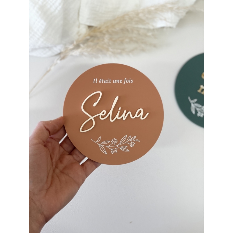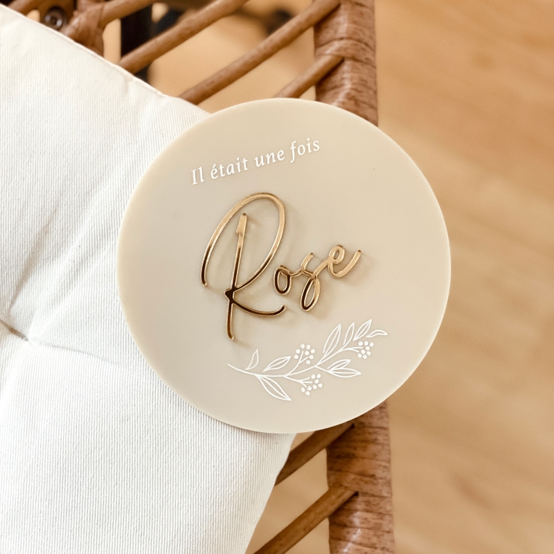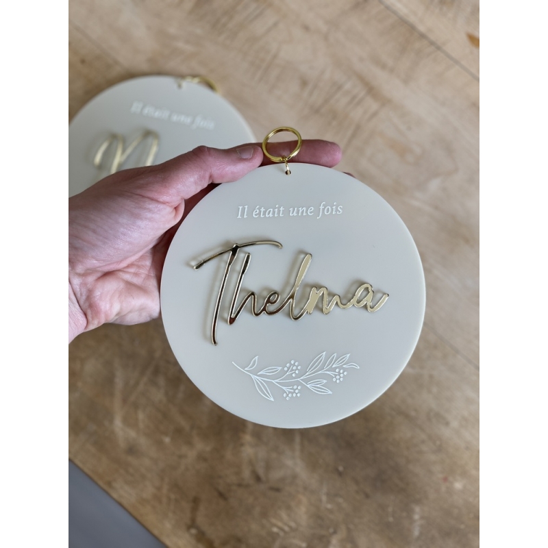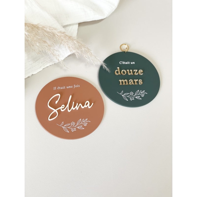 La commande comprend la personnalisation du prénom de l'enfant, ainsi que sa fabrication dans les matières choisies. Les lettres qui composent la date sont collées manuellement sur le médaillon et le brin végétal peint à la main (dans le cas du plexiglas).