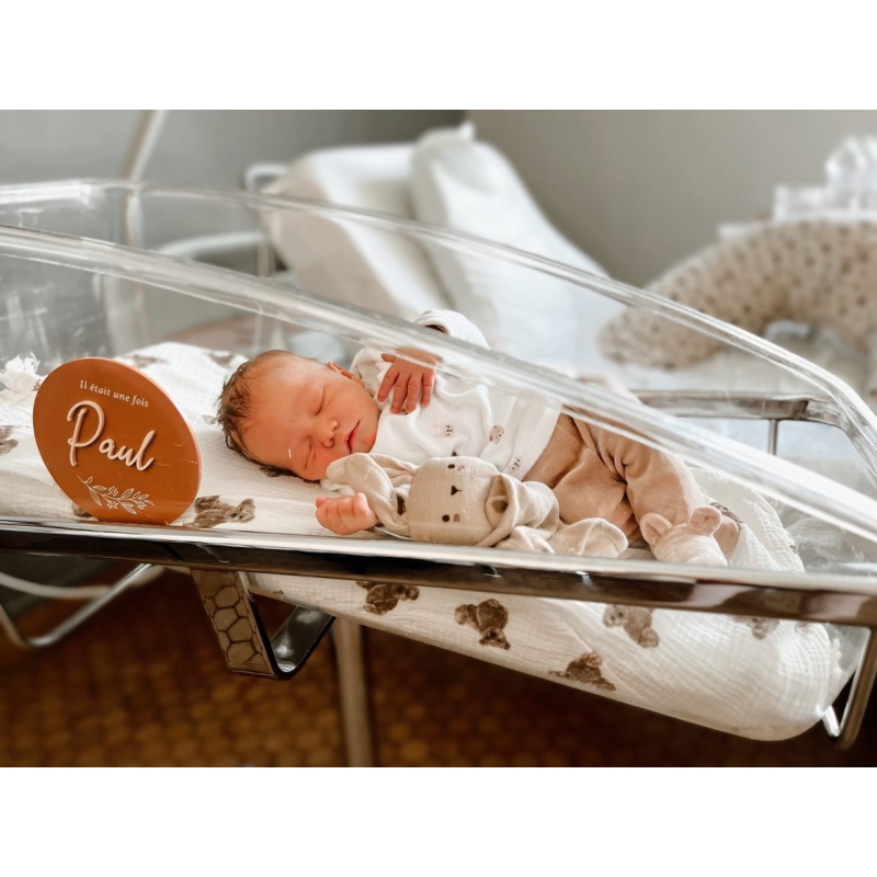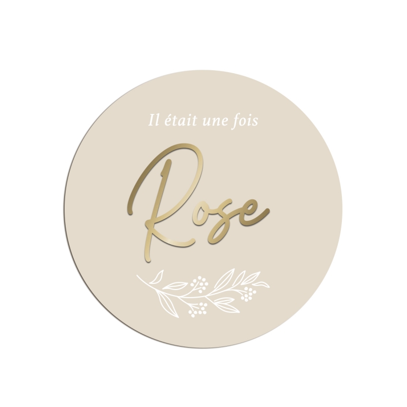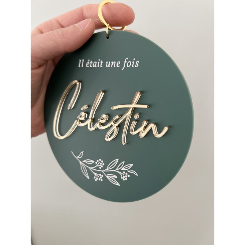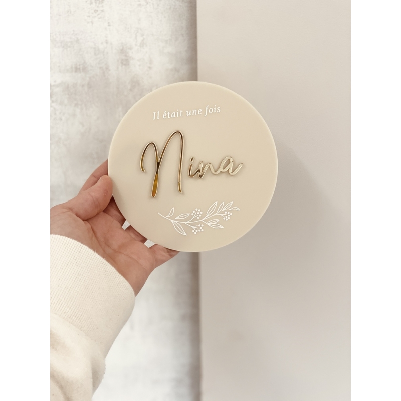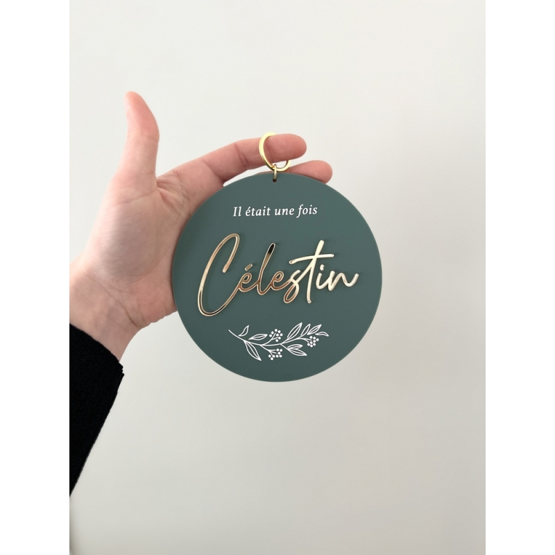La commande comprend la personnalisation du prénom de l'enfant, ainsi que sa fabrication dans les matières choisies. Les lettres qui composent la date sont collées manuellement sur le médaillon et le brin végétal peint à la main (dans le cas du plexiglas).