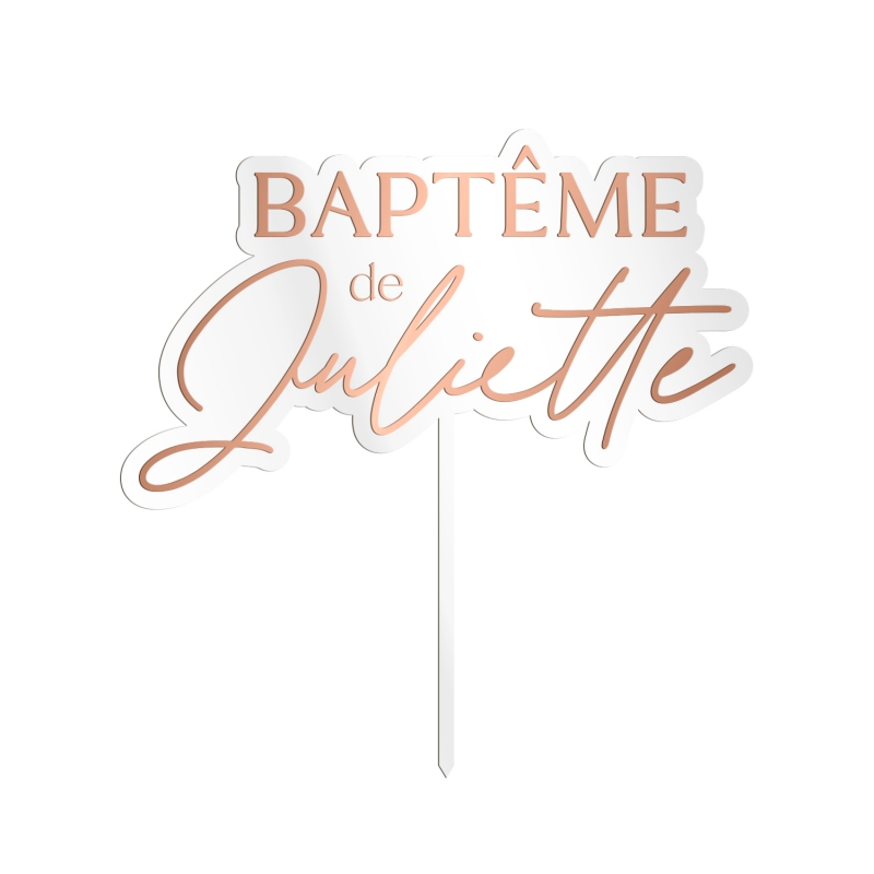 Pour le baptême de votre enfant, personnalisez un cake topper bi-matières avec son application de plexiglas miroir. Un rendu élégant et chic qui sera la cerise sur votre gâteau !