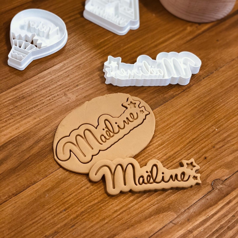 La commande de la presse à biscuits comprend la personnalisation avec un prénom, ainsi que sa fabrication.