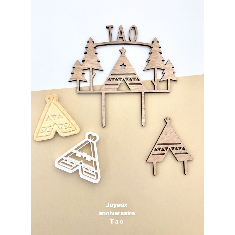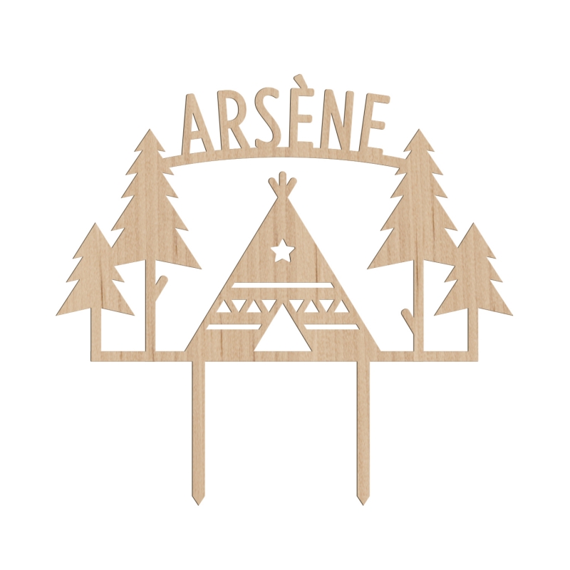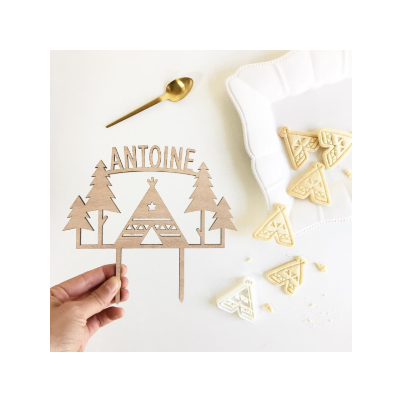 Pour l'anniversaire de votre enfant, personnalisez un joli cake topper en bois sur le thème "Into the wood". Ce modèle est composé d'un tipi et de 4 sapins qui mettront parfaitement en valeur le prénom de votre enfant. Cette figurine en bois personnalisée sera la cerise sur votre gâteau !