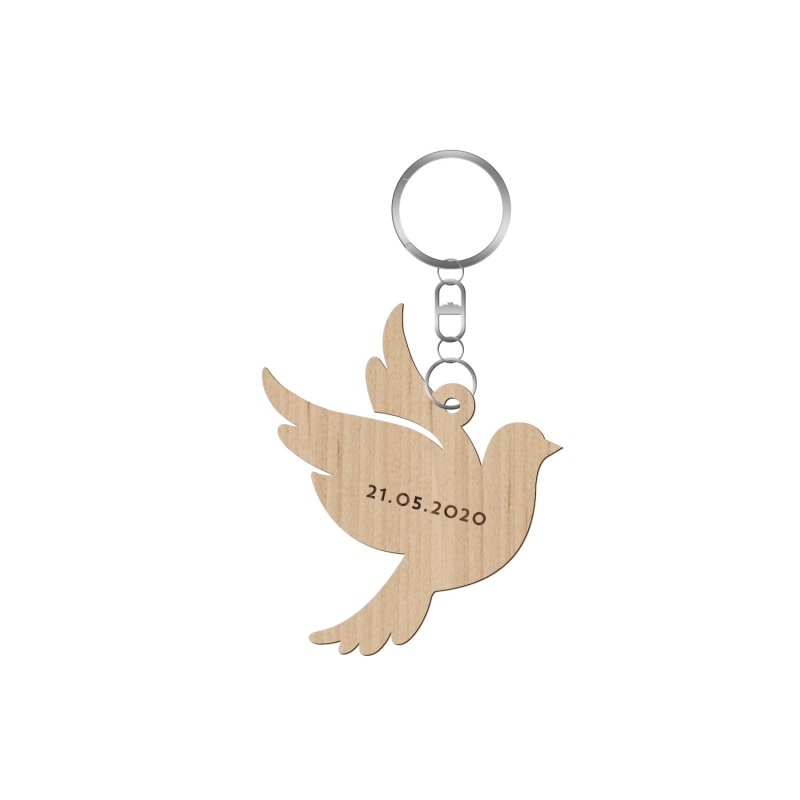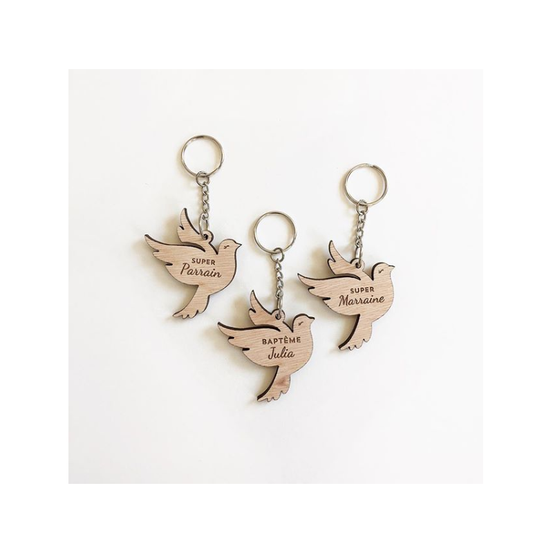 Offrez un joli porte-clés en forme de colombe à vos convives à l'occasion du baptême de votre enfant. Ce porte-clés est personnalisable au recto avec le prénom de votre enfant et au verso avec la date de l'évènement.