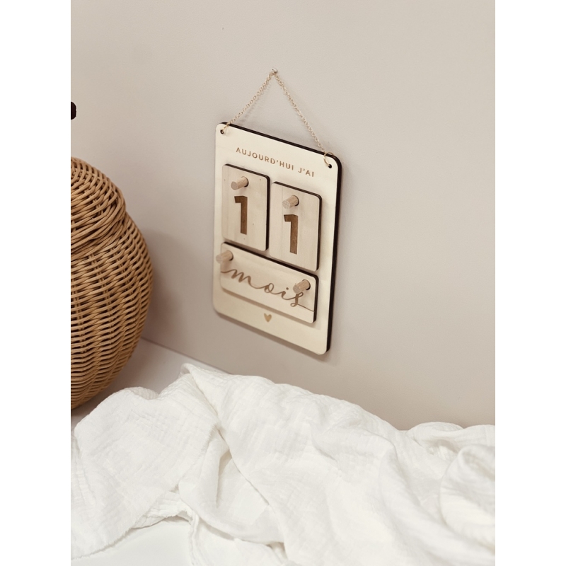 Carte étapes originale en bois sous forme de petit calendrier où vous pourrez changer le ou les chiffres selon l'âge de bébé. L'avantage de cette carte en bois est sa double utilisation : d'un côté, vous pourrez photographier chaque mois votre bébé avec la pancarte pour garder un souvenir de ses premiers mois ; et de l'autre, vous pourrez l'utiliser pour décorer sa chambre en la suspendant au mur.