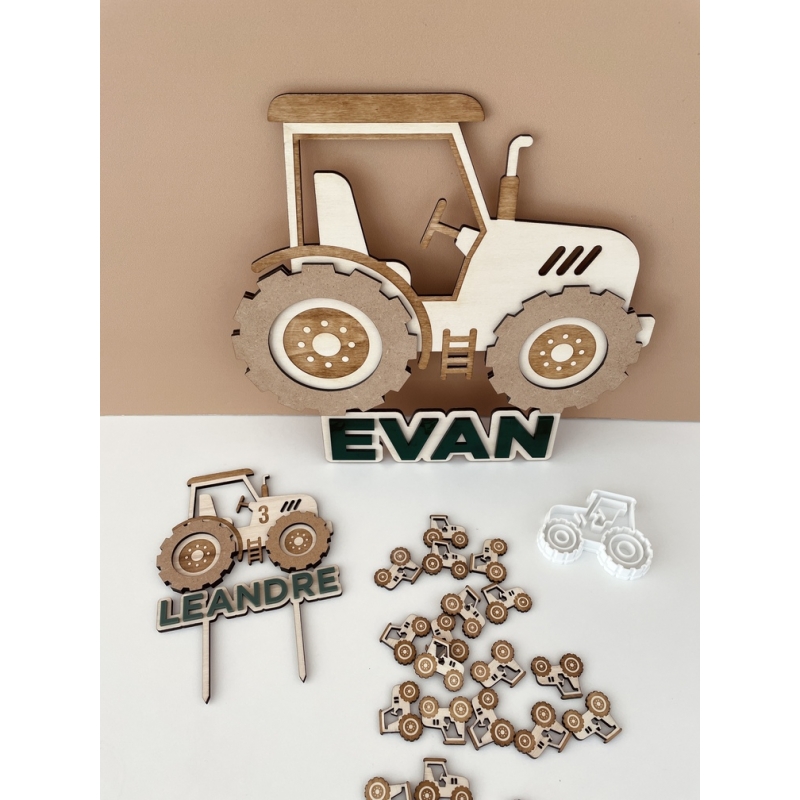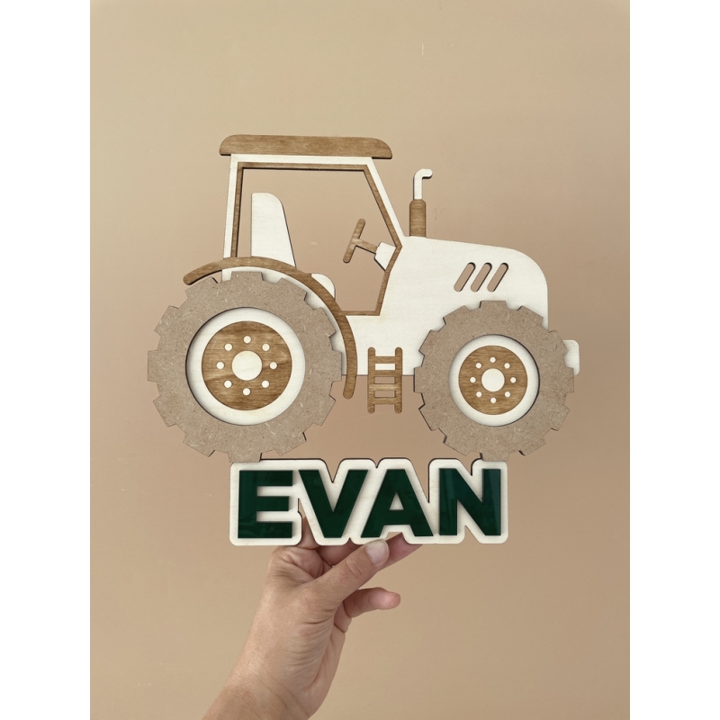 Décoration murale personnalisée en bois en forme de tracteur. Parfait pour décorer une chambre d'enfant ou un anniversaire. L'enseigne est personnalisable avec le prénom de l'enfant inscrit sous le tracteur.