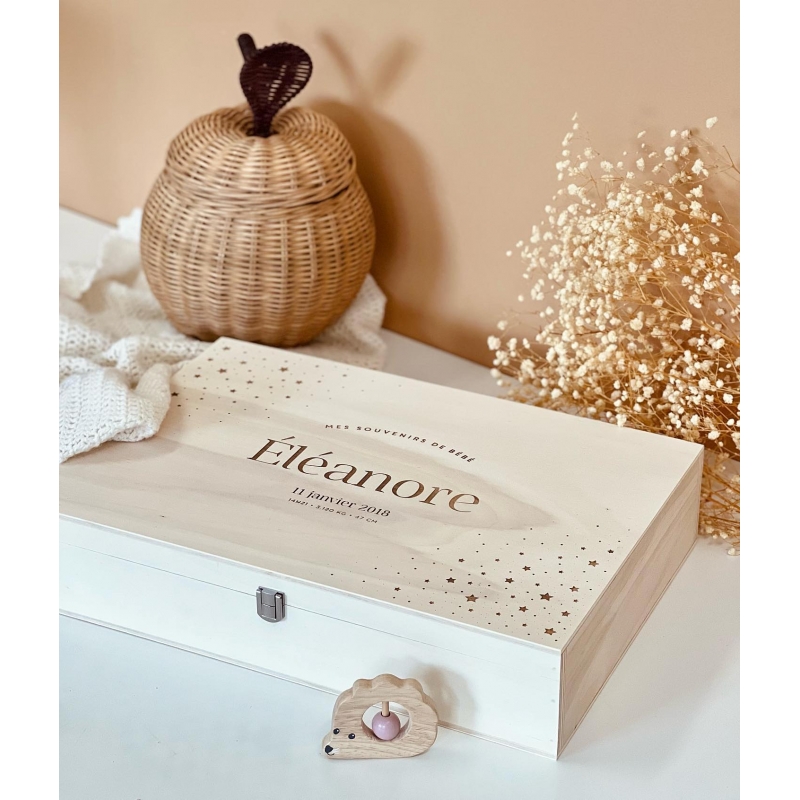Conservez les premiers souvenirs de bébé dans ce joli coffret en bois. Le modèle constellation mettra parfaitement en valeur le prénom de l'enfant et ses informations de naissance. Un cadeau unique à offrir ou à s'offrir !
