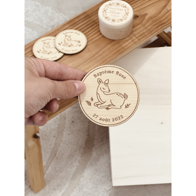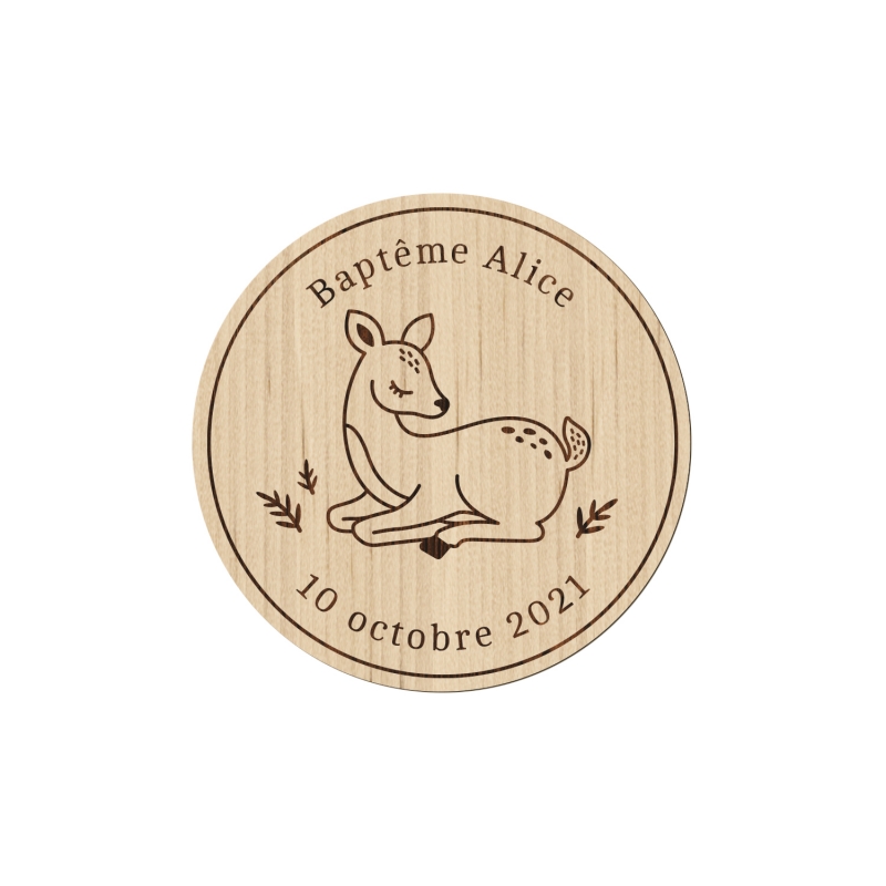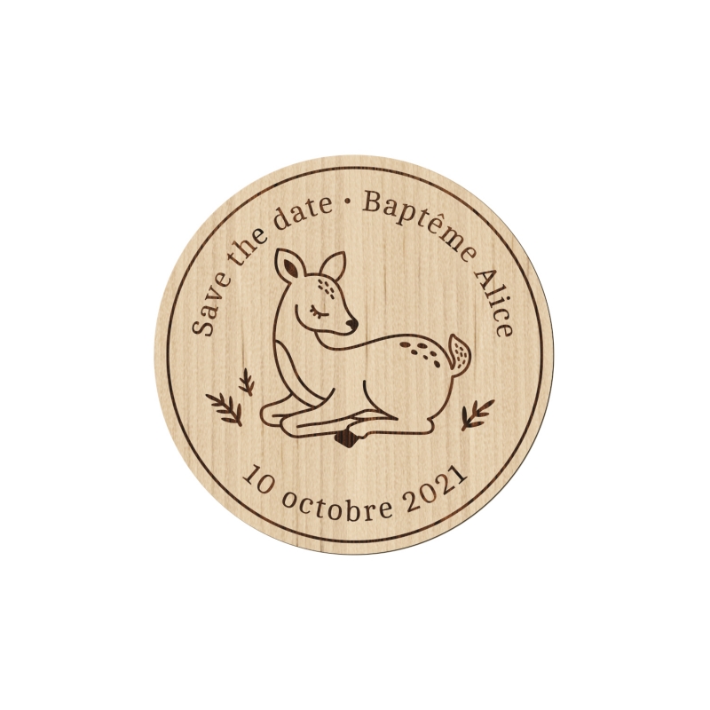 Personnalisez ce magnet en bois illustré d'un petit faon pour le baptême ou l'anniversaire de votre enfant. Vous pouvez l'offrir en guise de save the date pour annoncer la date de l'événement ou comme cadeaux d'invités pour les remercier de leur venue.