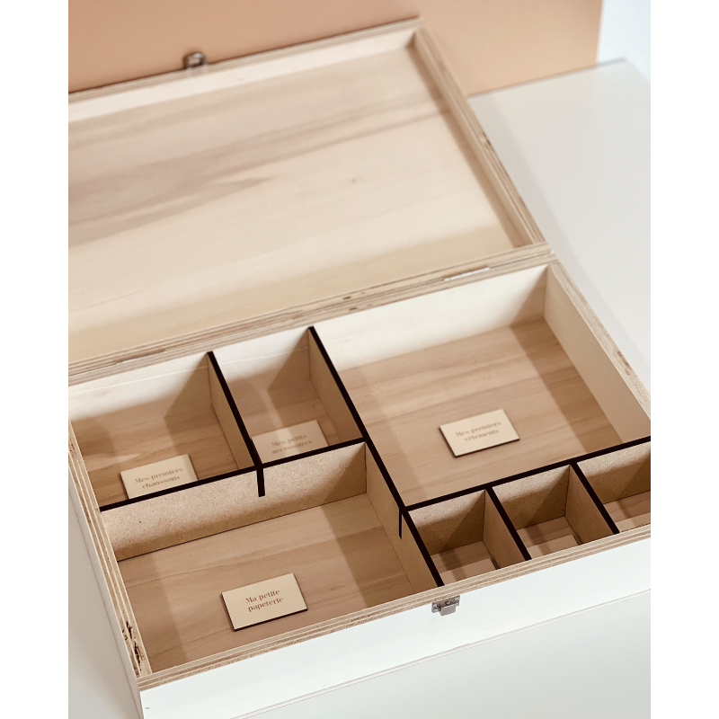 Si vous choisissez l'option avec compartiments, le coffret sera composé de 7 compartiments intérieurs avec une gravure indiquant :