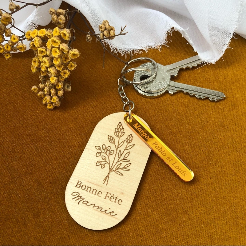 Ce joli porte-clé se compose de deux parties : la première réalisée en bois érable ou en plexiglas blanc opale avec l'inscription "Bonne fête Maman" ou "Maman chérie" ; et la seconde est une breloque avec le(s) prénom(s) en plexiglas miroir (coloris au choix parmi sélection).