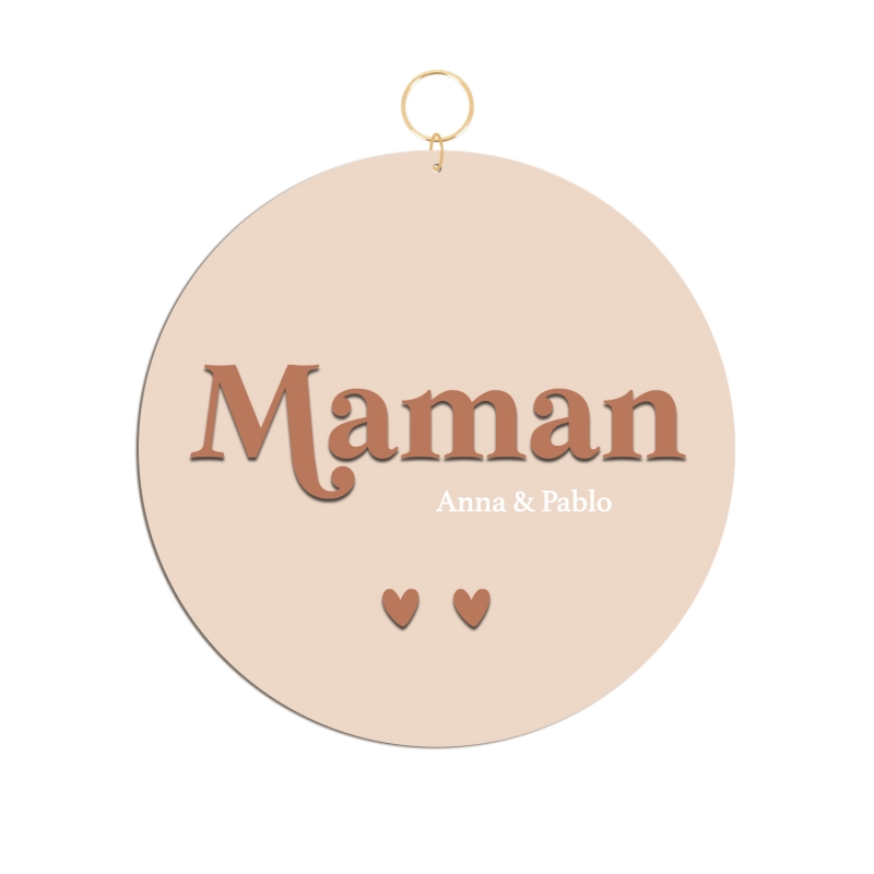 Joli médaillon décoratif à offrir à l'occasion de la Fête des mères. Vous allez adorer son association bi-couleurs en terracotta et beige. Sur le médaillon, le mot "Maman" est joliment écrit en relief et dans une police rétro. Les prénoms des enfants sont personnalisables, ainsi que le nombre de coeurs qui les représentent de manière symbolique.