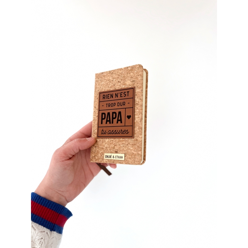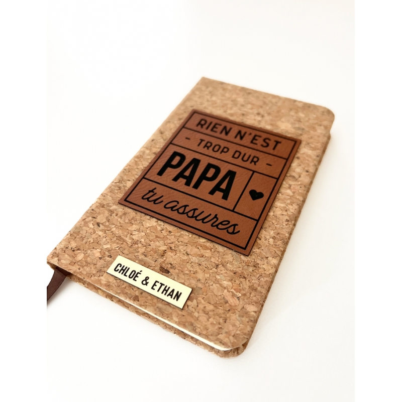 Pour la Fête des pères, offrez un cadeau utile à votre papa ou à celui de vos enfants : un carnet de notes. Grâce à son format pocket (A6) il pourra l'emmener partout avec lui dans sa poche de veste ou dans son sac. Sur la partie en cuir, les mentions "Rien n'est trop dur, Papa tu assures" ou "Les petites notes de Papa" sont gravées et les prénoms des enfants en bas en doré.
