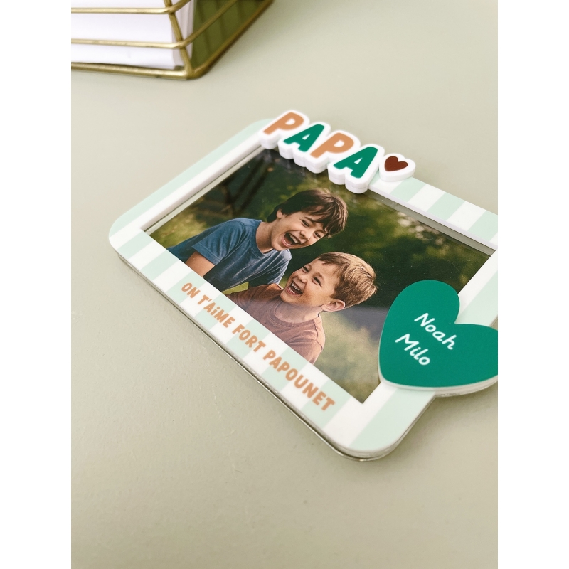 Un magnet photo à personnaliser pour un papa extraordinaire ! Avec son coeur prénom(s), ses couleurs joyeuses et son message qui donne le sourire, c’est le cadeau parfait pour la fête des pères ! À coller sur le frigo ou poser sur un bureau pour lui rappeler chaque jour combien il est aimé.