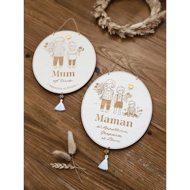 Pour la fête des grand-mères ou pour son anniversaire, offrez à votre mamie un merveilleux cadeau ! Cette jolie décoration en bois illustrée à l'effigie de ses petit-enfants lui fera sans nul doute très plaisir ! Elle est personnalisable avec les 3 illustrations représentants au mieux vos enfants, leur prénom en signature ainsi que la mention de votre choix (Mamie en or...).