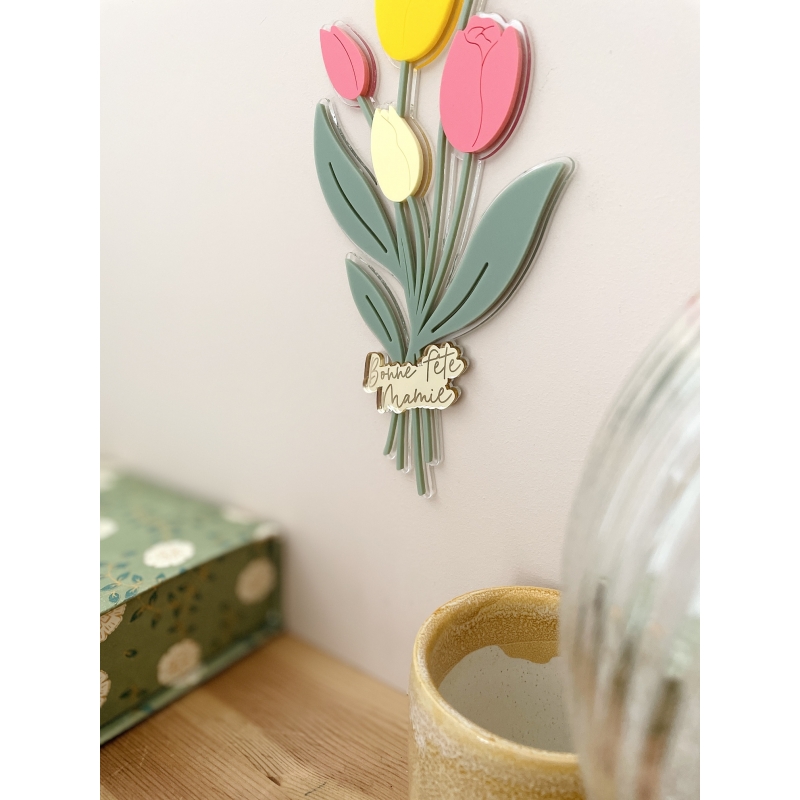 Offrez un bouquet de tulipes intemporel à votre grand-mère pour son anniversaire ou sa fête. Mieux qu'un vrai bouquet de fleurs, celui-ci ne fanera jamais et votre mamie pourra le conserver longtemps dans sa décoration murale. On adore son graphisme moderne et doux avec ses couleurs pastel.