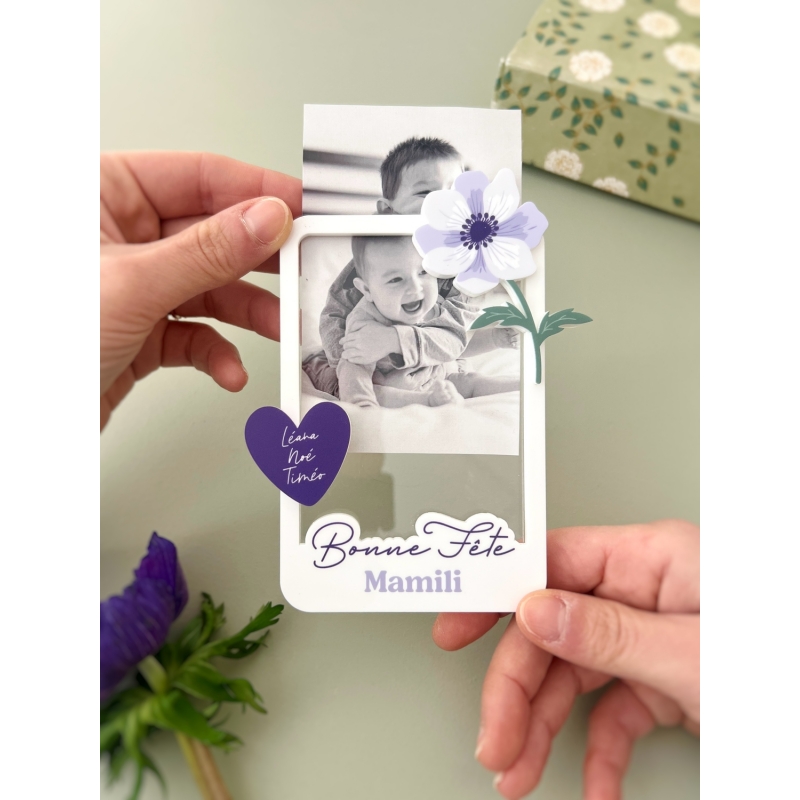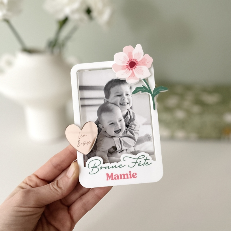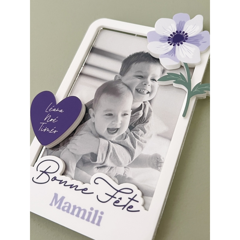 Offrez un joli magnet personnalisé pour la fête des grand-mères ! Vous pourrez y ajouter une photo ou un dessin de l’enfant, le tout personnalisé avec son prénom et le surnom de la mamie. Grâce à l'aimant, elle pourra mettre son joli cadeau sur le frigo et l'admirer à chaque fois qu'elle cuisine. Un cadeau unique et original, sublimé par le design floral de l'anémone violette.