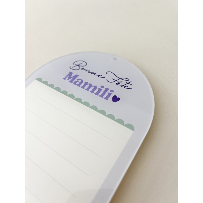 La commande du tableau mémo effaçable comprend la personnalisation du produit selon les textes indiqués. Merci de bien préciser chaque texte pour le haut du mémo et pour le bas.