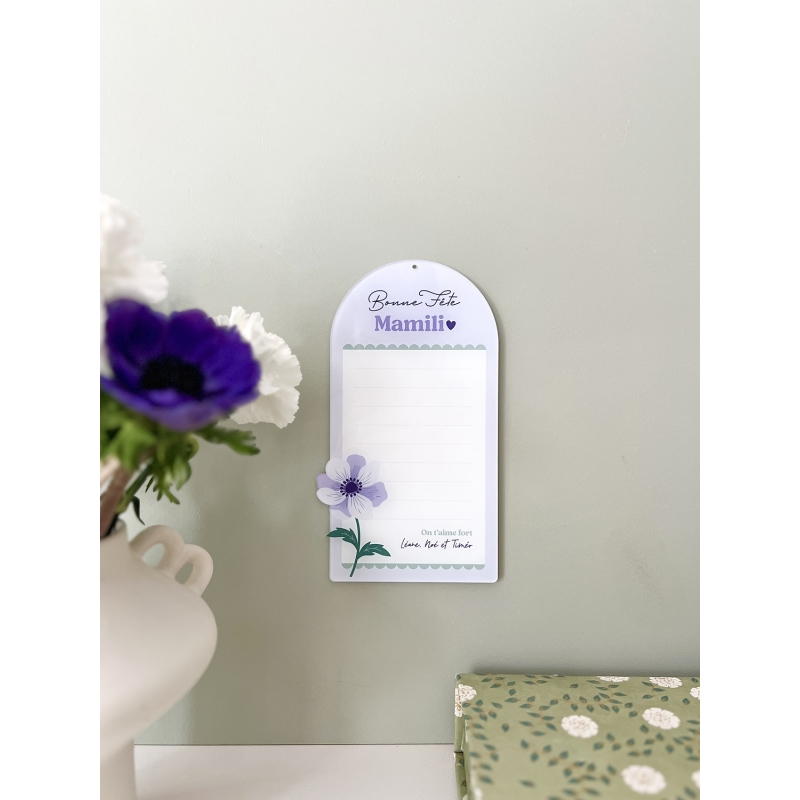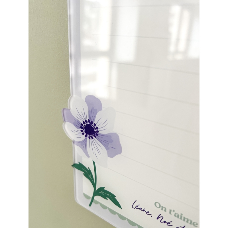 Offrez un joli tableau mémo effaçable pour la fête des grand-mères. Ce modèle plaira beaucoup à votre mamie avec son illustration d'anémone violette et ses couleurs douces et printanières. Le tableau mémo est en plexiglas, ce qui permet d'écrire dessus des mémos et pense-bêtes grâce à un feutre Velleda et s'efface facilement à l'aide un chiffon sec.