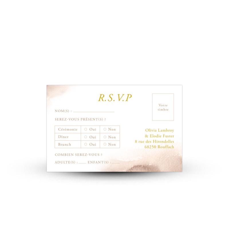 Glissez un carton réponse avec vos invitations de mariage afin que vos convives vous répondent de manière élégante et originale. Vos proches n'auront qu'à remplir les différents champs et à vous retourner la carte postale. Ainsi, vous recevrez chaque jour dans votre boîte aux lettres un petit carton réponse de vos invités.