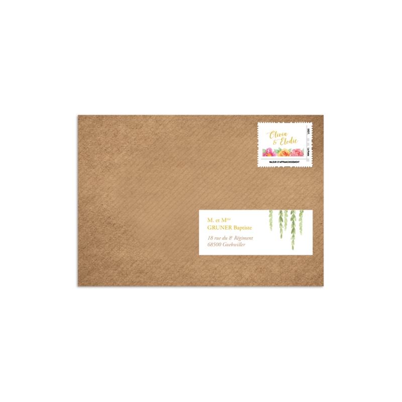 Décorez les enveloppes de vos faire-part de mariage grâce à des timbres personnalisés. Grâce à ce fichier numérique, vous pourrez réaliser des timbres assortis à votre papeterie de mariage. Ce modèle fleuri conviendra parfaitement pour les thèmes de mariage gipsy, coloré, bohème ou champêtre.