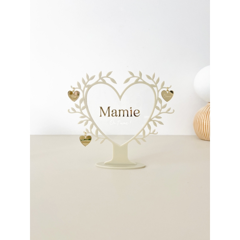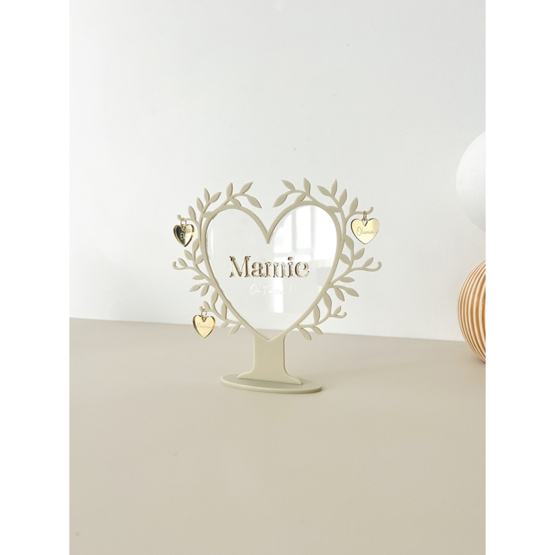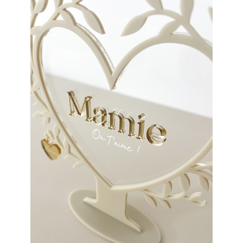 La forme végétale et le coeur central apportent une touche décorative élégante et intemporelle. Au centre, l’inscription Mamie accompagnée de On t’aime ! vient lier tous les prénoms et rappeler l’essentiel : l’amour transmis de génération en génération.