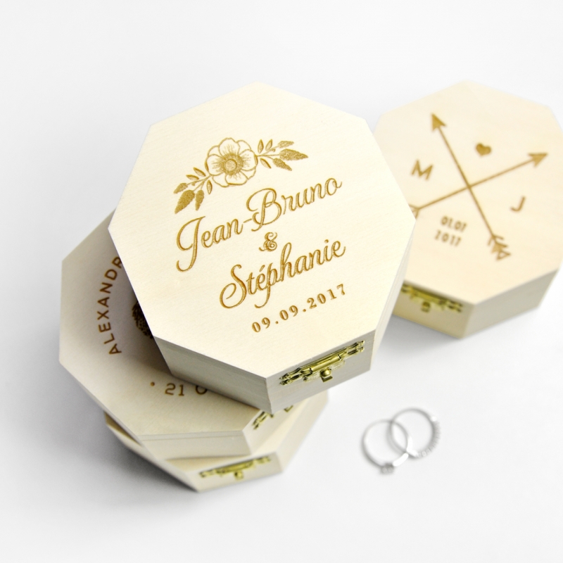 Chaque boîte peut être achetée avec un porte-alliances en bois personnalisé ou non. La commande comprend la gravure extérieure de la boîte (et celle du porte-alliances en option) avec les textes de votre choix.